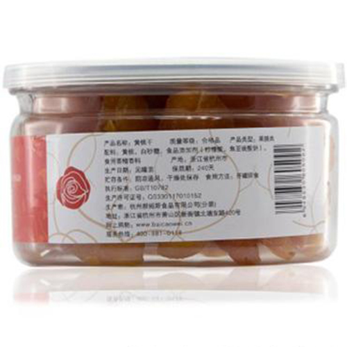 杭州郝姆斯食品有限公司主打產(chǎn)品百草味黃桃果肉黃桃干230g罐裝。