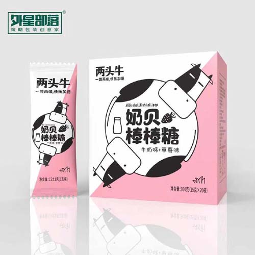 嘉興雅酷比食品科技有限公司主打產(chǎn)品外星部落兩頭牛奶貝棒棒糖箱裝300g。